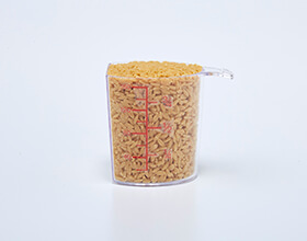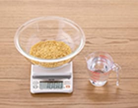 キッチンスケールがない時には、お米の計量カップをご使用ください。1合カップのすりきり1杯 (180cc) がダイズライス 約100gです。