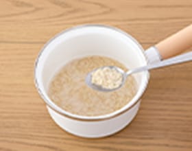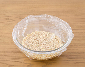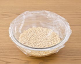 30分間吸水させる。※吸水時間を短縮されると電子レンジでの加熱時に吹きこぼれる可能性があります。