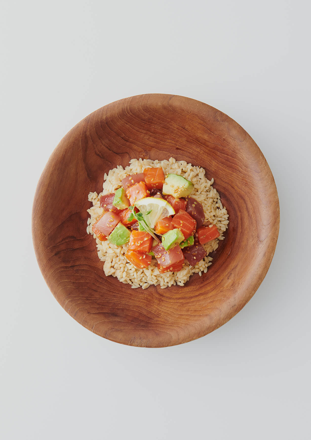タレのしみたマグロ&サーモンとねっとりとしたアボカド、つぶつぶ食感のダイズライスは相性抜群。